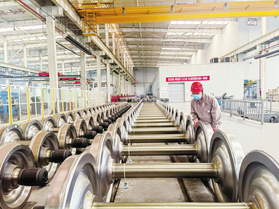 6月28日,太原重工軌道交通設(shè)備有限公司輪軸廠內(nèi),生產(chǎn)班組長(zhǎng)正在對(duì)輪對(duì)產(chǎn)品進(jìn)行信息核對(duì)和外觀質(zhì)量檢查。(蘇小宇攝)