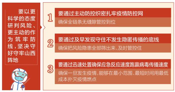 林武指出,今年以來,省委堅(jiān)決貫徹習(xí)近平總書記重要指示精神和黨中央決策部署,把疫情防控工作作為重中之重,加強(qiáng)統(tǒng)一領(lǐng)導(dǎo)、統(tǒng)一指揮、統(tǒng)一調(diào)度,團(tuán)結(jié)帶領(lǐng)全省上下成功應(yīng)對(duì)多輪疫情沖擊,全省疫情形勢(shì)總體保持平穩(wěn),為經(jīng)濟(jì)社會(huì)發(fā)展創(chuàng)造了良好環(huán)境。但也要清醒看到,全球疫情仍處高位,國(guó)內(nèi)本土疫情呈多點(diǎn)散發(fā)、多地頻發(fā)態(tài)勢(shì),我省外防輸入壓力仍然很大,疫情防控一刻也不能放松。各級(jí)各部門要以更科學(xué)的態(tài)度研判風(fēng)險(xiǎn)、更主動(dòng)的作為筑牢防線,通過源頭管控、監(jiān)測(cè)預(yù)警、快速響應(yīng)等有效手段,堅(jiān)決守好守牢山西陣地。一要通過主動(dòng)防控織密扎牢疫情防控網(wǎng)。牢牢把握“第一落點(diǎn)”有效管控的經(jīng)驗(yàn)做法和重要要求,做好入返晉風(fēng)險(xiǎn)人員管控,嚴(yán)格國(guó)際航班經(jīng)停太原入境人員閉環(huán)管理等措施,加強(qiáng)物流業(yè)進(jìn)、銷、儲(chǔ)、運(yùn)等全流程防控和信息監(jiān)管,確保全鏈條無縫隙管控到位。二要通過及早發(fā)現(xiàn)守住不發(fā)生隱匿傳播的底線。完善升級(jí)多點(diǎn)觸發(fā)監(jiān)測(cè)預(yù)警響應(yīng)系統(tǒng),加強(qiáng)重點(diǎn)場(chǎng)所、重點(diǎn)人群、進(jìn)口物品及環(huán)境監(jiān)測(cè)管理,加強(qiáng)縣城、農(nóng)村防疫工作,提升60歲以上老年人疫苗接種率,開展好常態(tài)化核酸檢測(cè),確保把風(fēng)險(xiǎn)隱患全部篩出來、及時(shí)管控住。三要通過迅速處置確保應(yīng)急反應(yīng)速度跑贏病毒傳播速度。健全完善平急一體化突發(fā)疫情應(yīng)急指揮體制,用好“露頭就打、以快制快、并聯(lián)推進(jìn)、日清日結(jié)”工作機(jī)制,加強(qiáng)基層流調(diào)人員日常培訓(xùn),確保一旦發(fā)生疫情,能夠在最小范圍、最短時(shí)間用最低成本撲滅疫情燃點(diǎn)。