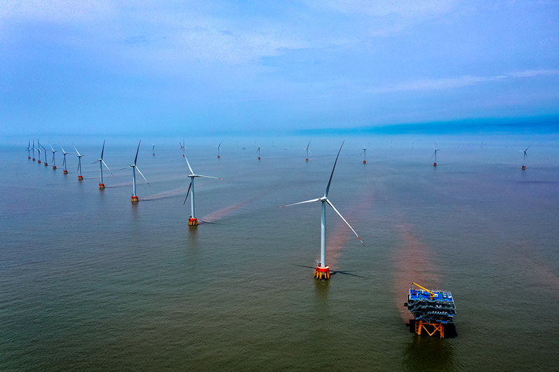 2021年5月16日拍攝的浙江舟山北部海域的中廣核岱山4號海上風電場(無人機照片)。新華社發(fā)(姚峰 攝)