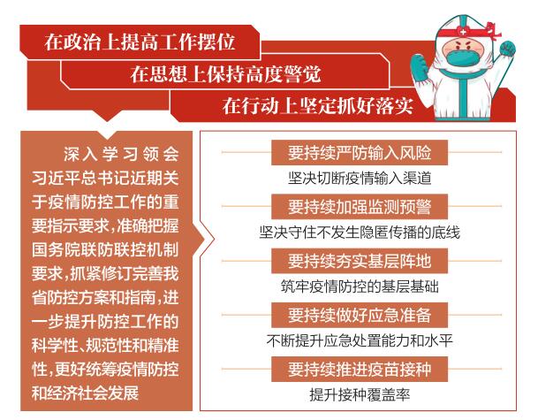林武指出,當(dāng)前,全國疫情總體處于低水平波動,我省疫情形勢保持平穩(wěn)。但要認識到,疫情防控如逆水行舟,越是疫情形勢向好,越要保持清醒、如履薄冰。要深入學(xué)習(xí)領(lǐng)會習(xí)近平總書記近期關(guān)于疫情防控工作的重要指示要求,準(zhǔn)確把握國務(wù)院聯(lián)防聯(lián)控機制要求,抓緊修訂完善我省防控方案和指南,進一步提升防控工作的科學(xué)性、規(guī)范性和精準(zhǔn)性,更好統(tǒng)籌疫情防控和經(jīng)濟社會發(fā)展。一要持續(xù)嚴防輸入風(fēng)險,進一步完善工作機制,用好“第一時間、第一落點”管控等行之有效的措施,堅決切斷疫情輸入渠道,牢牢掌握工作主動權(quán)。二要持續(xù)加強監(jiān)測預(yù)警,堅持“點與面結(jié)合、癥狀監(jiān)測與核酸檢測結(jié)合、傳染病監(jiān)測系統(tǒng)與其他部門監(jiān)測系統(tǒng)結(jié)合”原則和“四早”要求,完善升級多點觸發(fā)監(jiān)測預(yù)警響應(yīng)系統(tǒng),扎實抓好社會面常態(tài)化核酸篩查,堅決守住不發(fā)生隱匿傳播的底線。三要持續(xù)夯實基層陣地,科學(xué)統(tǒng)籌配置一線防控力量,加強對防疫人員的關(guān)心關(guān)愛,充分調(diào)動村(社區(qū))等廣大基層組織的積極性,筑牢疫情防控的基層基礎(chǔ)。四要持續(xù)做好應(yīng)急準(zhǔn)備,健全完善平急一體化突發(fā)疫情應(yīng)急指揮體制,強化應(yīng)急培訓(xùn)演練,科學(xué)統(tǒng)籌使用方艙醫(yī)院等防控設(shè)施,不斷提升應(yīng)急處置能力和水平。五要持續(xù)推進疫苗接種,堅持“政府找人、行業(yè)動員、衛(wèi)健打苗”工作模式,實施敲門行動,扎實細致做好60歲以上老年人的疫苗接種工作,提升接種覆蓋率。
